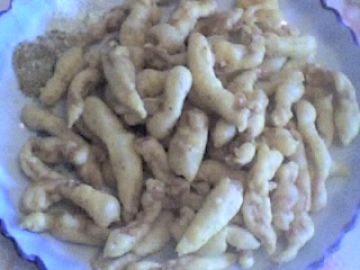 里脊肉100克 鸡蛋1个 淀粉适量 食用油500克 (实耗油50克) 香油1小匙 椒盐1小匙 味精0.5小匙