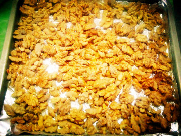 2、放烤盘,烤箱预热,180°c烤约10到15分钟。烤好的核桃可以当茶点,每天吃几粒,即利口又养生,是不错的零食!