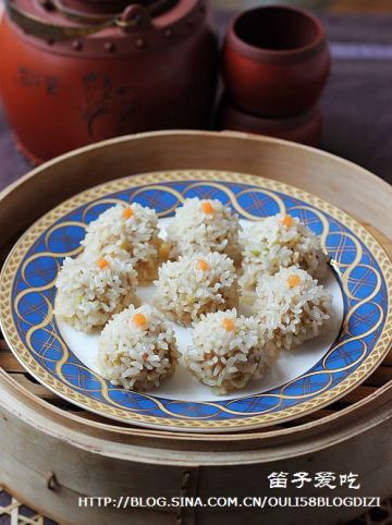 2.每个丸子周身滚上一层生糯米,摆在盘中,入笼中蒸15分钟。