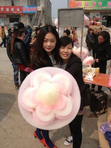 1. 首先,将准备好的白砂糖20克,红色砂糖20克和蓝色砂糖20克,放于盆中,准备好小勺一把,竹签两根,做好操作前的用料准备工作。先用小勺盛取20克红色砂糖,倒入机器出糖器内,代糖丝飞出后,手拿一根竹签顺时针旋转,将糖丝缠绕到竹签上,缠绕过程中保持手持竹签的平衡度,并且保持前低后高移动的状态,均匀的将糖丝全部缠绕到竹签上。