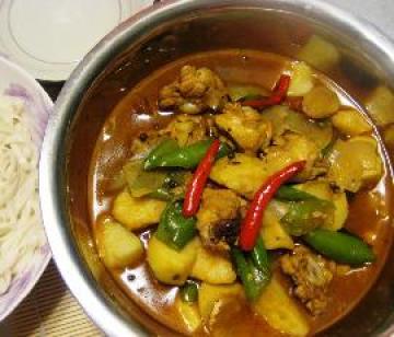 鲜鸡一只、土豆四个、皮带面、青红辣椒各一个、葱姜蒜若干、花椒一把、八角、香叶、桂皮适量、朝天椒一把、生抽酱油、砂糖、盐、