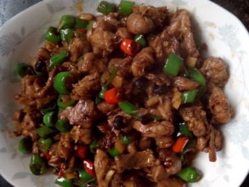2、油锅烧6成热,下姜蒜、花椒炒香,在放兔肉爆炒、放豆鼓、青红椒翻炒放味精和盐装盘即可。