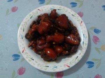 4. 加入生抽~老抽~醋~酒和糖,焖到猪手软绵就可以上碟了。