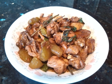 嫩子鸡一只,酱油,食油,米酒各一杯,姜块,葱,小麻油