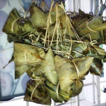 6、把洗干净修剪好的粽叶,依照以下视频的指导, 把粽子绑好4后, 用大火蒸90分钟即可。(有的人蒸30分钟而已, 但是我们家会蒸比较久,这样子粽子的味道会比较融合,糯米饭会比较软, 比较好吃)。