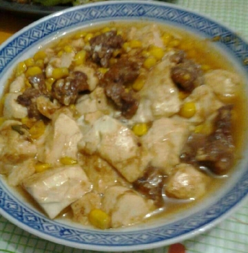 盒装嫩豆腐,免治牛肉碎(也可用猪肉碎),玉米粒,生抽,白糖,蚝油,生粉,水