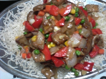 3、三层肉煎香,爆香姜茸、蒜茸和大葱, 然后加入杂豆, 红 灯笼椒一起炒,加少许水和调味b,勾芡收干汁,盛起装入炸好的芋头碗上乘热食用。