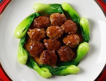 10、蒸好后把葱姜大料等捡出来不用,把汤倒炒锅里,把丸子在盘子里码好,把汤坐开勾小芡浇在丸子上即成,周围可以摆点焯过的青菜更漂亮。