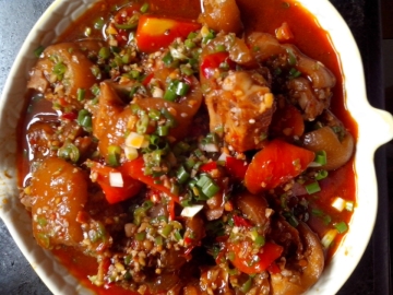 3、热油锅把姜蒜末、豆瓣、辣子红油一起炒香,再放猪蹄、胡萝卜、冰糖一起翻炒片刻,掺水盖过猪蹄1厘米,盖锅盖焖粑,汤汁不多时加入青椒翻几下,少勾点芡,加点醋、鸡精,装盘撒上葱花即可。