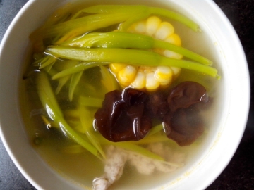 2、锅内掺水烧开,加入鸡油、姜丝、玉米棒、肉片、先煮个几分钟,再加黄花和木耳煮过4分钟即可,黄花要煮熟,不煮熟会中毒的哈。起锅时放盐和鸡精即可。