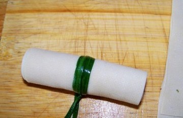 8、将肉泥铺在千张上,卷起,用韭菜缠紧即可。