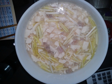 2、把高汤烧开,加入精盐及水淀粉勾芡羹状,然后放入切成丁的豆腐煮开。
