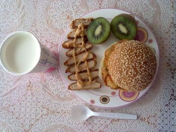 .4. 炸熟的鸡肉一块夹入了面包中 一块切长条状摆放盘子里 点缀些沙拉酱 再放些水果 就可以了