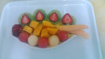 1.做好的椰子冰淇淋糕打底平碟。2.西瓜球3个、哈密瓜球1个、香瓜球1个、奇异果4片、草莓1个切花、一片芒果切6、2片木瓜摆尾。这个味道还是不错的