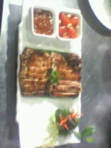 鸡腿;2个(去骨)。辣椒仔5分之1瓶。香菜4棵。蒜6个 。耗油2勺。白兰地1勺。蜂蜜3分之1勺.白胡椒面少许一起腌制半小时,进烤箱(180度)呈表面金黄就ok拉。吃时记得陪上泰式甜鸡酱。