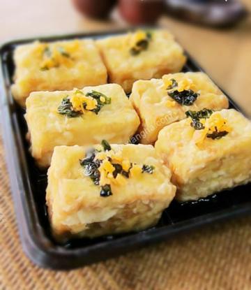 7、锅内油烧热,放豆腐块炸至金黄膨胀捞出。淋上酱汁,撒上胡萝卜碎、海苔碎即可。香香的豆腐味呀~~~~~