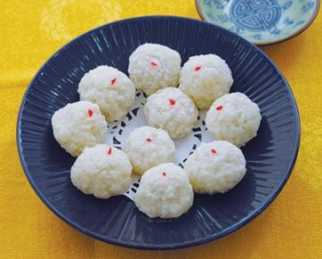 2、准备5个小碗,洗净后抹点油,把软面团分到5个碗内,上面撒上京糕丁、青梅丁。上屉,用旺火蒸30分钟即成。吃时一切两半即可。