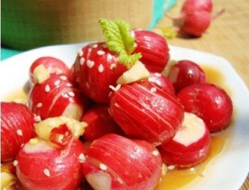 1、将樱桃罗卜去缨,洗净,用刀拍裂,加入少许的精盐腌制20分钟,捞出沥干备用。