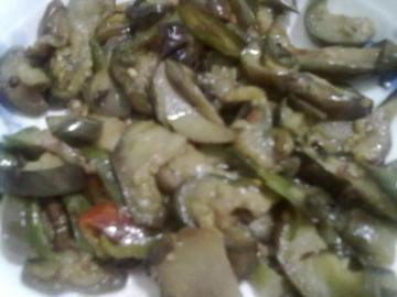 1,把茄子切成片状,待油热后放入(茄子吸油,放油时要比平时炒菜稍多些)。