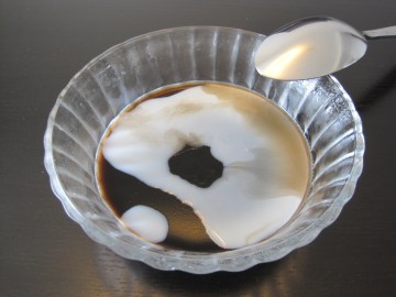 4、奶粉4匙,白砂糖1匙用75ml溫水融化。