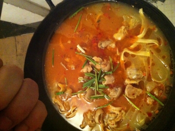 放一瓢半水,姜丝,辣椒粉放少量,三瓢味精,鸡精一瓢胡椒粉,一瓢糖,一瓢骨香粉,,作料放好大火煮四五分钟。这个跟腌制的东西打底的锅底是粉皮和千张。倒出锅,方一瓢红油给色,上面再撒些葱花即可上桌!