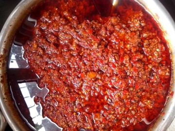 熬制:将植物油2.5 cup(约500克,菜籽油为上选,可用大豆色拉油代替)锅中烧开,放置温凉后下葱白姜块,见到有细小的泡沫从姜葱四周升起时将炉火转至最小,然后下入花 椒,丁香,桂皮,小茴,草果,八角,香叶,紫草,辣椒面,搅拌匀,熬制30-40分钟,熬制期间时常搅拌一下,以防糊锅底。30-40 分钟后加入白芝麻继续熬制30-40分钟,关火。将熬好的红油晾至温凉后连油带料倒入一个大的玻璃量杯或其他带嘴的玻璃或瓷质容器中,用保鲜膜封好在冰箱 冷藏室内放置24-48小时以使辣椒面的辣味,红色,香料的香气进一步溶解于油中。同时找几个洗干净晾干的带盖玻璃瓶备用。