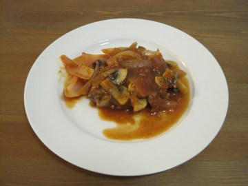 帶骨豬排2塊,洋蔥2分之1顆,蘑菇3顆,蒜2瓣,蕃茄醬5匙,鹽適量,黑胡椒粉適量,水一點點,橄欖油一點點,料酒2匙,黑胡椒碎適量