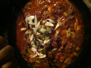 (4)吊锅在平台灶上煲开,面上撒火腿丝,点吊炉上桌。