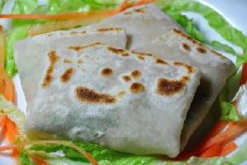 1.用高筋粉和温水和成如饺子面那种硬度,擀成薄饼(约平锅底盘一样大),用餐巾纸、油在平锅内擦一层,小火煎至薄饼变色即可。