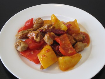 5、放入步驟(1)翻炒至5分熟,加入步驟(2)和一點點水翻炒,炒至彩椒差不多熟時加入蕃茄醬5匙,白醋2.5匙,白砂糖1小匙和一點點鹽拌炒均勻,裝盤。