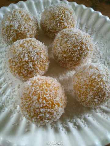 6、出锅后趁热均匀的滚上椰丝,冷却就可以吃了!糯糯的夹带着椰香和紫薯的糯米糍做好了!有谁想来一口。金色南瓜和紫色紫薯就像是春天里的两个恋人,缠绵悱恻,若即若离,一口下去黏黏的你侬我侬!