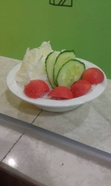 取冰砖,放在绵冰机上刨,下面放个碗接着,西瓜,黄瓜装饰