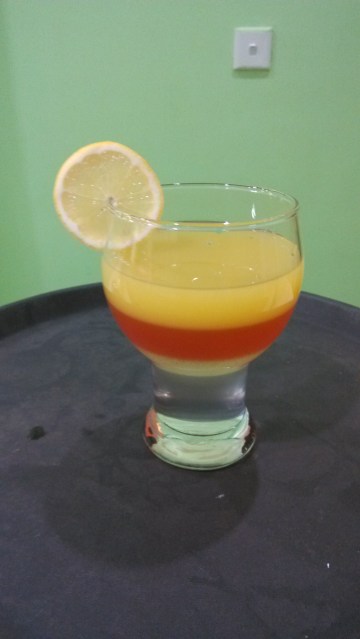 芒果汁(草莓,雪梨)20ml兑100的纯净水搅拌,先倒芒果汁放个吸管,把其他两种果汁往吸管倒,速度要慢,过程不能动摇。不然会混在一起
