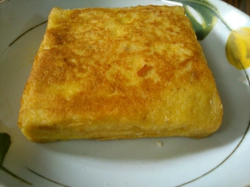 5.小火开锅,下油,等油稍微热了就把醮满蛋液的面包放进去,反复将双面煎至金黄,三边也要煎一下,上碟再淋上少许炼乳。