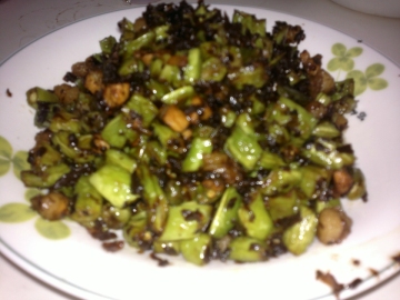 3、油加热后放入葱、姜末、绞肉、虾米末、榨菜末炒翻,最后倒入炸过的四季豆干煸出香味,并淋下酱油、糖、精盐、水、香油、味精、醋,继续翻炒至汁干即可。