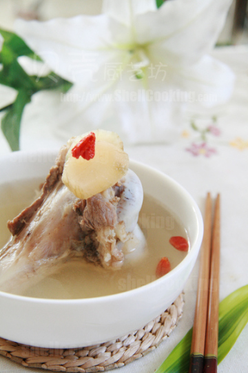 6)焯烫好的猪大骨跟猪里脊放入煲里,放入枸杞,大火煮沸,转小火煲1小时左右,放入雪莲果片,继续煲制半小时,关火,放入盐调味即可