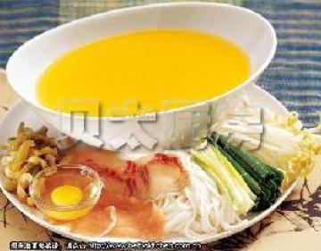 4、食用时,用高深的大碗,放入20克鸡鸭肉,并将锅中滚汤舀入碗内,加盐、味精、胡椒粉、芝麻油、猪油或鸡鸭油、芝麻辣椒油,使碗内保持较高的温度。汤菜上桌后,先将鸡肉、猪肉、鱼片生片依次放入碗内,用筷子轻轻搅动即可烫熟,再将韭菜放入汤中,加葱花、芫荽,接着把米线陆续放入汤中,也可边烫边吃。各种肉片和韭菜可蘸着作料吃