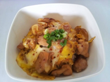 去骨鸡腿肉100公克,洋葱丝1/2颗,鸡蛋2颗,白饭适量,水100㏄,酱油30㏄,味醂25㏄,米酒15㏄
