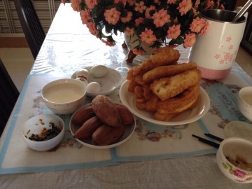 我们家的早歺是:鸡蛋、地瓜、油条、豆浆、黄瓜小菜、炝芥菜丝