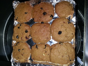低粉100 克,玉米胚芽油40克,红糖40克,提子干40克,桃仁30克,热水50克,樱桃朗姆酒20克,泡打粉1.2克