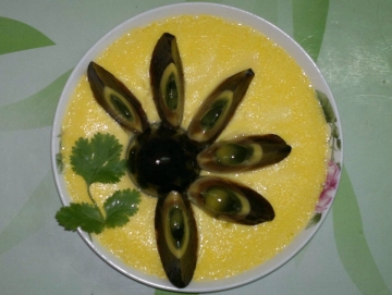1.鸡蛋打成蛋液,熟咸蛋剁碎,加入蛋液中,放少许盐和鸡精调味。