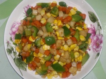 2、热锅下油,爆香蒜片,放入胡萝卜粒和玉米粒翻炒一会儿,然后放马蹄粒继续翻炒。