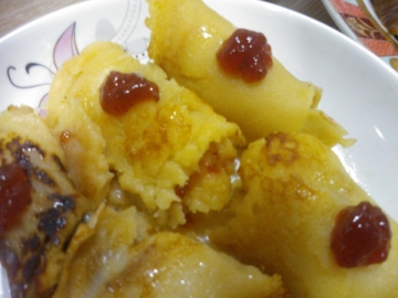 因为我放的是炼奶,较粘稠,所以加3勺面粉,如果是牛奶的话,就放多一些面粉,最后搅拌出来的面糊一定是汤勺舀起来成三角状,会滴下的那种。太稀得的话煎不出来的。