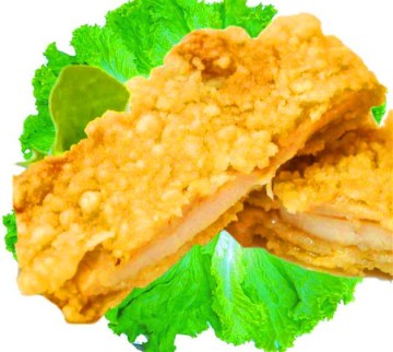 ②炒锅烷热,置熟植物油烧至五成热,将猪排逐块投入炸至金黄色,捞起初成狭长条装盆。随盆带辣酱油或卡夫奇妙酱。