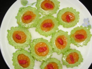 2、给苦瓜焯水时,加几滴色拉油和少许油,能更好的保持苦瓜的翠绿。焯好水的苦瓜从沸水锅捞出后迅速放到凉白开里过凉,也是保持苦瓜色泽和口感的良方。