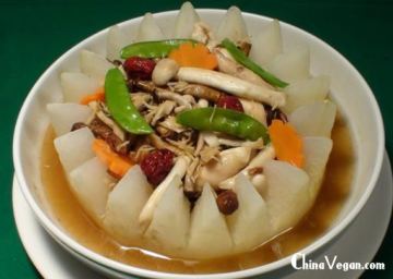主料:冬瓜900公克、素肉丝50公克、鲍鱼菇200公克、鸿喜菇200公克、鸡腿菇200公克、红枣6粒、姜丝60公克、红萝卜(切花片)50公克、绿色青菜1束