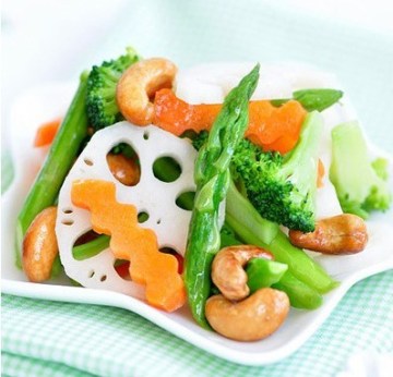 主料:腰果40克 莲藕、芦笋、西兰花、胡萝卜各70克