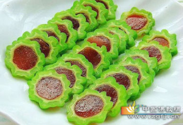1.苦瓜洗净,去掉瓤,切成薄片,山楂糕切丁