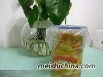 1. 娃娃菜3包、清洗干净晾干水分(如果家里有暖气,最好中午清洗晾到晚上制作。如果没有暖气,晚上睡前清洗晾到第二天中午制作。) 2. 制作所需的食材有:胡萝卜、盐、白醋、白砂糖、鸡精、味精、芝麻油、红醋、陕西油泼辣子(要想味道好,油泼辣子最好自己制作) 3. 把娃娃菜的外层和菜心分开,菜心单独放在一边待用。【菜心】 4. 首先把娃娃菜的外层菜叶每一片纵向切开成长条状,一片叶子可以切三条也可以切两条切忌不要切的太细。【以下是腌渍三包娃娃菜一共所需的盐,如果菜特别鲜活水分就大,那盐就需要在多一点】 5. 把切好的菜叶分成三份,先取一份放进一个菜盆中,撒上少许盐用手均匀的揉搓,力度一定要轻否则会折断菜叶。 6. 揉好盐的菜单独放好,切胡萝卜成片状不用盐揉,直接洒在盆地。 7. 再把刚才揉好盐的菜叶平铺在胡萝卜片上。 8. 用盐揉搓菜心,然后平铺在菜叶上。 9. 用保鲜膜盖上,放置20分钟。 10. 把以上用盐腌渍好的菜搅拌均匀后放进菜筐里盖上保鲜膜,空掉多余的水分。 11. 十分钟后........ 12. 把多余水分倒掉,把菜全部倒入盆中,先放白醋(三包娃娃菜的用量是:原谅我没有量杯,在这里我只能用尺寸比表示,我用的海天牌白米醋450ml装,用学生尺从瓶口处量,我一共用了16厘米的量。)放入每一种调味品后都要搅拌均匀后,再放下一味调味品....... 13. 以上程序全部完成后如下:(三包娃娃菜所需的容器大小是1.9l左右,我虽然比较喜欢用特百惠的产品,但是,在腌制泡菜方面,我个人认为还是乐扣比较好用。) 14. 二十分钟后............(在容器口放一个保鲜袋以免汁水沾在盖子上不好清洗,个人经验!) 15. 放置冰箱冷藏一星期都不会变质,三包的量一般可以吃5天。酸酸甜甜,在配上陕西油泼辣子的辣,是泡面和稀饭的好伴侣....) 16. 【酸甜娃娃菜完成了!!!】