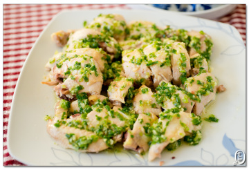 4.待鸡腿在冰水里浸泡凉透,取出,斩块装盘,把葱花和切成丝的红椒撒在上面.